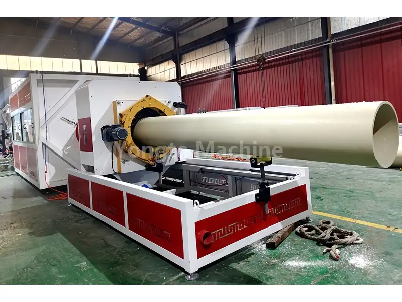 Yongte specializuojasi gaminant 280-500 mm PVC vamzdžių gamybos liniją, skirtą didelio skersmens standžiųjų vamzdžių, naudojamų statybos, žemės ūkio ir pramonės sektoriuose, gamybai. Turėdama SJSZ92/188 kūginį dviejų sraigtų ekstruderį su patobulinta varžtų konfigūracija, ši sistema garantuoja nuoseklų PVC medžiagų plastifikavimą (SG-5, UPVC, CPVC) ir didelį užpildo medžiagos procentą (CaCo3). Jis palaiko pastovų 400-500 kg per valandą našumą. Pagrindiniai šios gamybos linijos pranašumai apima aukštą automatizavimą, didesnį našumą, puikų gaminio našumą, į vartotoją orientuotą mechaninę inžineriją, energijos taupymą ir nesudėtingą veikimą. Pažymėtina, kad 280–500 mm PVC vamzdžių gamybos linijoje yra įrengtas servo variklis ir energiją taupanti šildymo sistema, užtikrinanti puikų energijos vartojimo efektyvumą esant ~110kW darbinei galiai (instaliuota galia ~250kW) – 15–20% mažesnė, palyginti su panašaus pajėgumo standartinėmis PVC vamzdžių mašinomis. Tai atsiranda dėl optimizuoto varžto dizaino, kuris sumažina medžiagos atsparumą ir energijos švaistymą plastifikavimo metu, taip pat efektyvių servovarklių ir greičio keitiklių, kurie dinamiškai pritaiko maitinimo tiekimą pagal gamybos poreikius.