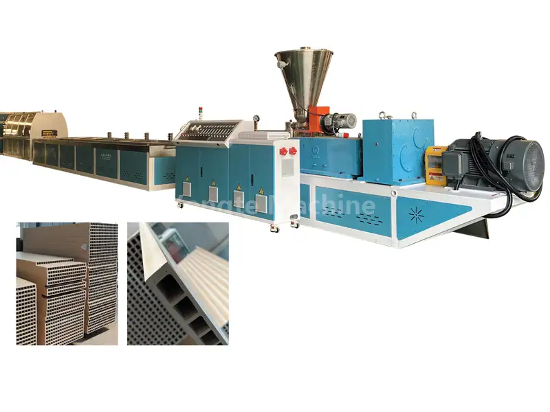 Specialiai sukurtas kūginis dviejų sraigtų ekstruderis gali efektyviai transportuoti medienos miltų ir PVC dervos mišinius, greitai plastifikuoti medžiagas, kad būtų išvengta medienos miltų karbonizacijos ar PVC skilimo, pagerinti gamybos efektyvumą ir sumažinti energijos sąnaudas. Jame yra servo variklis, sumažinantis energijos suvartojimą 15-20%, tiesioginės pavaros vertikali pavarų dėžė su dideliu perdavimo efektyvumu ir stabiliai veikiančia, patvari ir energiją taupanti automatinė šildymo ir temperatūros valdymo sistema.